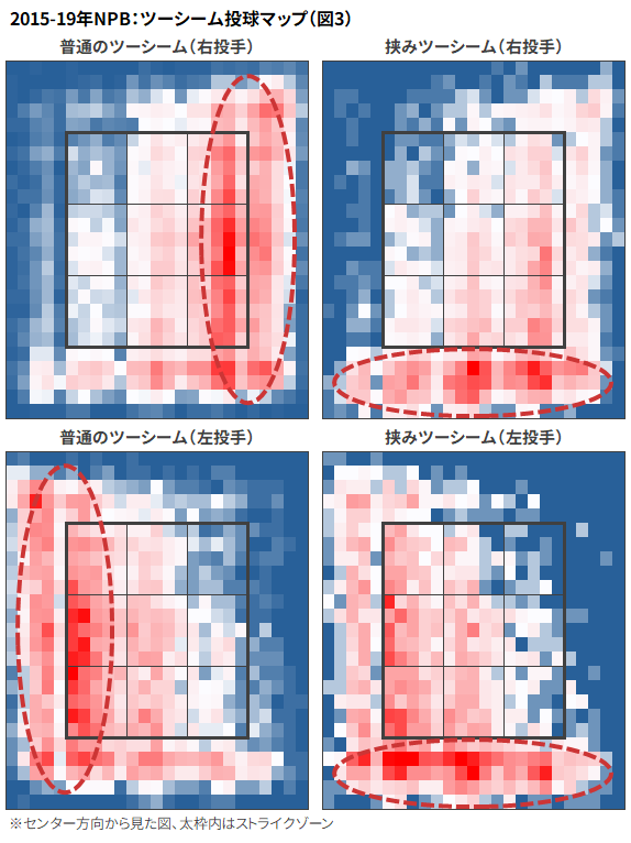 挟みツーシームが普通のツーシームと異なる点に、使い方の違いが挙げられる。図3は、図2にある投手が実際にツーシームを投じたゾーンを、ヒートマップで表したものだ。色が赤いほど、そのゾーンに多くの球が投げられていたことを意味する。