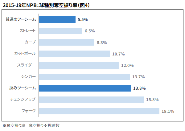 投球の結果を見ると、特に大きな差が出たのが奪空振り率だ。普通のツーシームは変化が小さいこともあり、他の球種と比べても空振りを奪いにくいのに対し、挟みツーシームはシンカーやチェンジアップといった縦変化のボールと比べても、遜色ない数値を残している(図4)。軌道や使い方、性質などを鑑みても、やはり「挟みツーシームは縦の変化球」という認識が実態に即している。