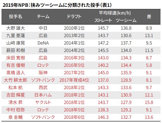 普通のツーシームと特殊なツーシームに明確な境界線はないため、今回は「ストレートとの平均球速差が5キロ」で両者を区切った。ストレートより5キロ以上遅いのが特殊なツーシーム、それより速いのが普通のツーシームである。特殊なツーシームに関しては、今や亜細亜大にゆかりのない使い手も多いことと、データスタジアムでは専らそう呼ばれていることから、暫定的に「挟みツーシーム」と名付けた。以降は、この分類に基づいて話を進めていく。