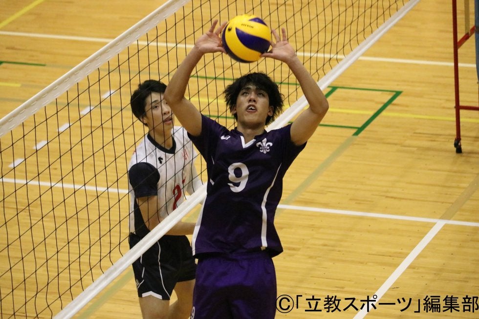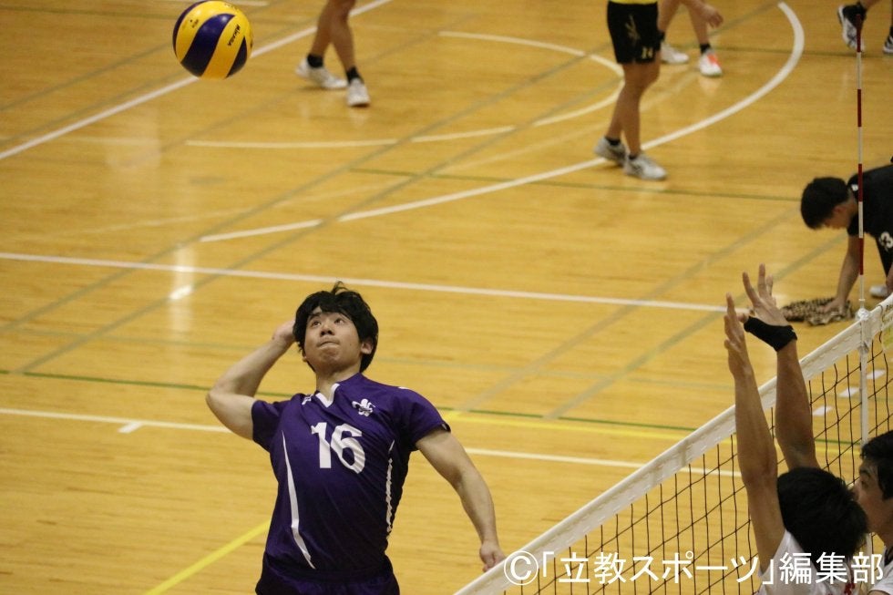 接戦を制した立大が先手を取る。第1セット序盤、♯11星倉(文1)や♯12矢野(済1)のスパイクに相手もミスも重なってポイントを稼ぎ、9-5と4点のリードを奪った。しかし、相手のタイムアウト明けからは強烈なスパイクに苦しみ、主将の♯1羽田(営4)のブロックや、♯8九冨(コ2)のレシーブなどで懸命に守るも、じわじわと点差を縮められ、ついに23-23の同点に追いつかれる。それでもリードは許さず、押し切った立大が第1セットを取った。続く第2セットも立大ペースで進み、精彩を欠く相手に♯13井原(済1)、♯19濱野(済2)のスパイクや、中嶌の技ありツーアタックが決まり、終始リードを保ったまま第2セットも連取。2試合ぶりの勝利に王手をかける。