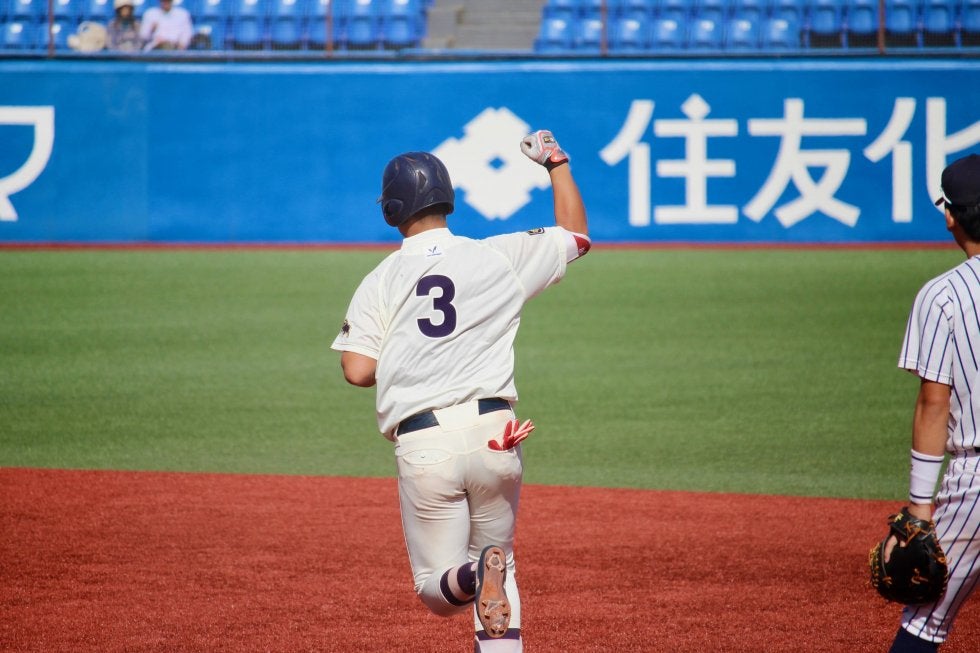 初回に満塁本塁打を放った明大・喜多が1塁ベースを周ったところで力強くガッツポーズ