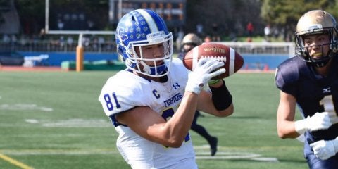 <写真・勝ち越しのTDを決めた阿部> 10月27日、兵庫県王子スタジアムにて2019年度関西学生アメリカンフットボ…