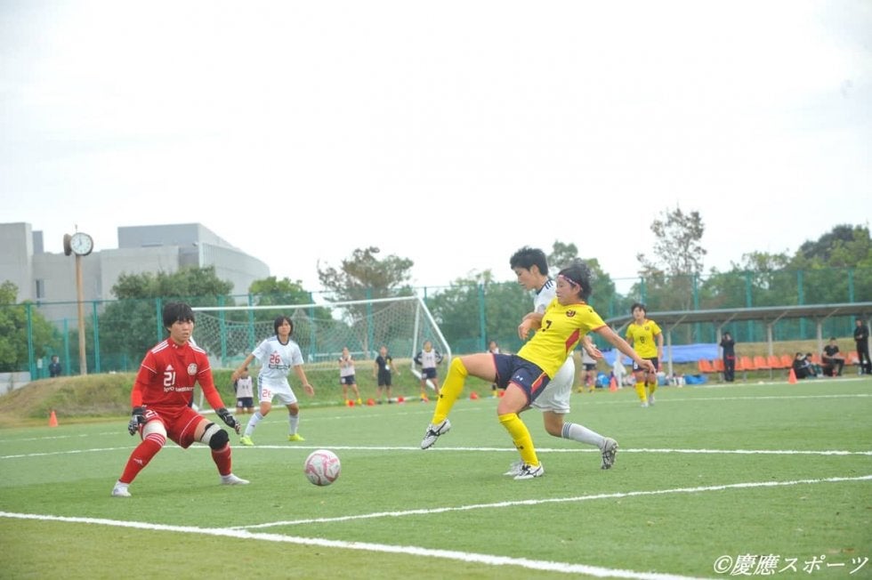 「相手が予想外に5−4−1だった」(伊藤監督)と語ったように相手の守備的な布陣に対し、どう攻撃を組み立てていくかが注目された。試合開始直後から、いきなり慶大に決定機が訪れる。逆サイドからのボールをPA内で受けた松木里緒(環4・常盤木学園)が相手DFをかわし、右足を振り向くもキーパー正面。7分には秦野くるみ(総1・藤枝順心)が持ち上がると、空いたスペースにスルーパスを供給。これに反応した松木がグラウンダークロスを送るも工藤真子(総4・日テレ・メニーナ)は追いつくのが精一杯。触れただけのシュートはゴール右に外れた。一方、その3分後にはPA付近からミドルシュートを打たれるも、GK加藤楓琳(総4・常盤木学園)のファインセーブで先制点を許さない。19分には秦野が倒されFKを獲得。得点とはならなかったが、慶大ペースで試合が進む。