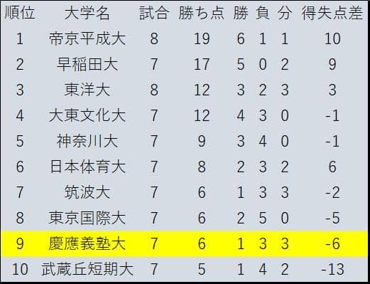 「全体的に自分たちでゲームをコントロールできるようになってきた」(加藤)と話したように、ここ数試合は慶大が試合を支配している時間帯を多く作れている。「DF陣の中で信頼関係もできていますし、連携も取れていると思う」(工藤)と、今日の試合でもロングボールの処理、裏への対応など集中した守備が見られ2試合連続でクリーンシートを達成した。今日は他会場でも試合が行なわれ、慶大の順位は前節と変わらず9位。ただ6位から10位まで勝ち点3差の大混戦となっている。泣いても笑ってもあと2試合。「1試合1試合のことしか考えてない」(伊藤監督)と語ったように、まずは来週の日体大撃破に向けて最善の準備を尽くす。