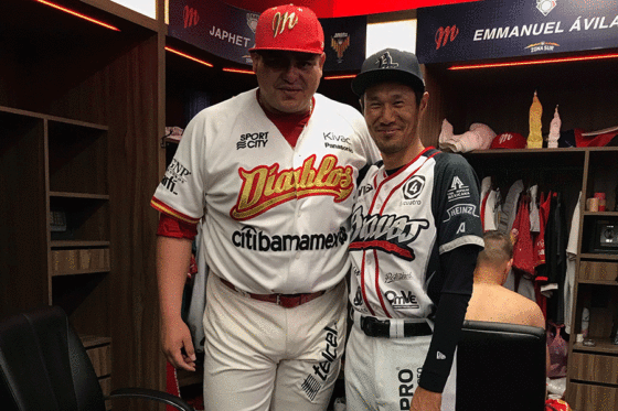 メキシカンリーグでプレーするジャフェット・アマダー(左)と久保康友【写真:福岡吉央】