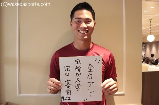 1997(平9)年11月16日生まれ。177センチ、80キロ。東京・早実高出身。商学部4年。外野手。左投左打。自身最後のシーズンにして、初めてレギュラーとして駆け回っている田口選手。今回はカフェで行われた取材でしたが、終始和やかな雰囲気で、そして丁寧に答えてくださりました。チーム随一の『愛され男』が檜舞台で輝きを放ちます!