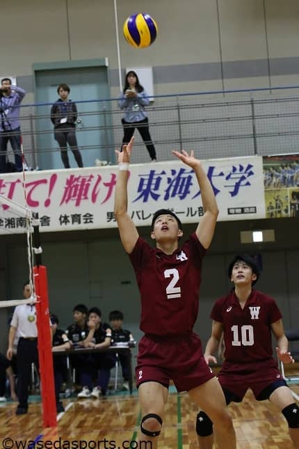 暫定2位につけており新井雄大(3年)を筆頭とした攻撃力の高い選手が多く在籍する東海大との一戦。中村駿介(スポ3・大阪=大塚)のサーブで幕が上がった。早大は東海大のサーブやクイックに苦しみ立ち上がりはなかなかサイドアウトが切れない展開が続く。しかし1-6と点差が開いている場面から徐々に反撃を開始する。宮浦健人(スポ3=熊本・鎮西)のサービスエースなどで順調に点数を重ね7-9に。そこから大塚達宣(スポ1=京都・洛南)のクロススパイクを皮切りに3連続得点を獲得しこの試合で始めてリードする。このまま中盤も早大ペースで試合は運ばれた。セット終盤、22-18から吉田悠眞(スポ2=京都・洛南)に代わって入った上條レイモンド(スポ2=千葉・習志野)が早大コートに甘く入ったボールをすかさずダイレクトで押し込んで23点目。その後ブロックなどで2点返されるもセットポイントから途中出場した中島明良(法1=京都・洛南)がサーブで崩すと東海大のなんとかつないだボールがアンテナに触れて25点目。松井監督がいない中で早大の采配が光りセットを先取した。