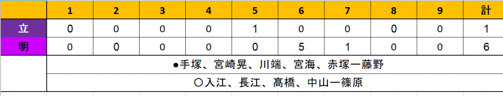 | 赤塚 (コ4=麗澤瑞浪) | 1 | 9 | 0 | 0 | 0 | 0 |