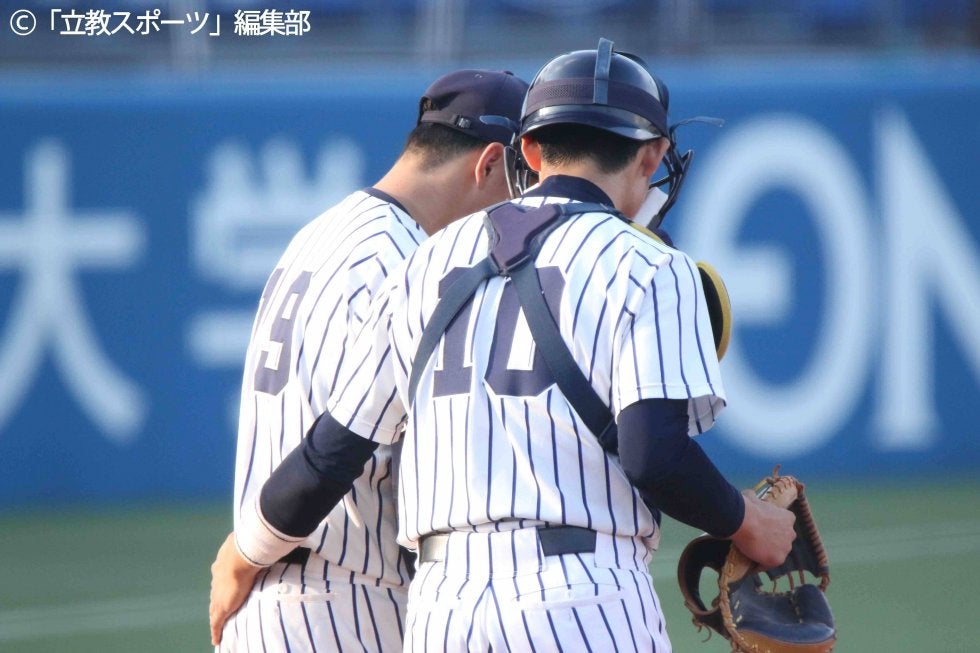 安定した投球を見せた手塚(コ4=福島(写真左))とそれをリードする藤野(営4=川越東)