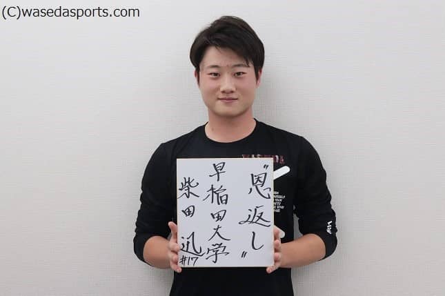 1998(平10)年6月2日生まれ。177センチ、77キロ。東京・早大学院出身。社会科学部3年。投手。右投右打。今秋も好調を維持する柴田選手。色紙には綺麗な字で『恩返し』としたためてくださりました。お世話になった4年生への感謝の気持ちをかみ締めて、華のマウンドで躍動します!