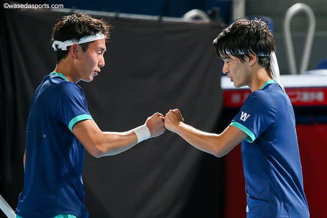 この試合がペアとしてのラストゲームとなった古賀・安上組。「悔しい試合も多かったんですけど、ここまで2人で励ましあいながら頑張れた。ありがとうございましたと言いたい」(古賀)。「一緒にプレーできることが心強かったですし、一緒にプレーしている時間が楽しかったです。そこに僕の大学テニスは救われたし、ここまで勝つことができたので、すごく感謝しています」(安上)。1年時からペアを組み続け、最後は早大のダブルス1にまで駆け上がった古賀・安上組は最高の舞台でその旅路を終えた。