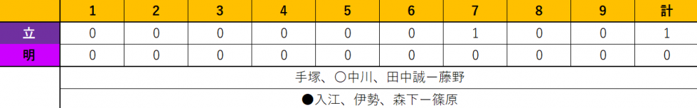 | 1 | 田中 誠 (コ4=大阪桐蔭) | 0 | 0 | 0 |