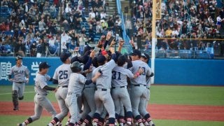 4試合終了と同時に歓喜の輪が出来上がる。慶大が開幕9連勝で3季ぶり37度目のリーグ優勝を決めた 慶大が7対1…