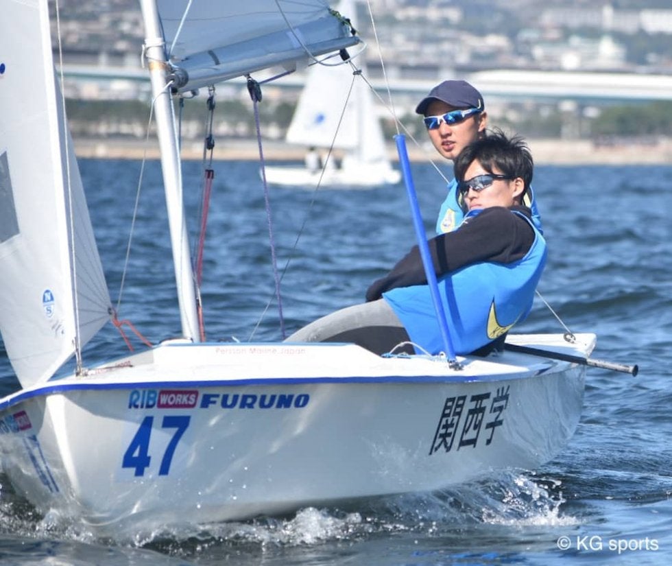 <写真・きのうの2レース目で首位を取った藤原(奥)・畑山組> 11月2日、兵庫県新西宮ヨットハーバーにて第84回全日本学…