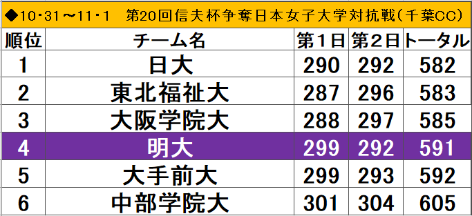 朝日杯に引き続き、2日間にわたって行われた信夫杯。初日を4位で折り返した明大は巻き返しを図ろうと2日目に臨んだ。スコア…