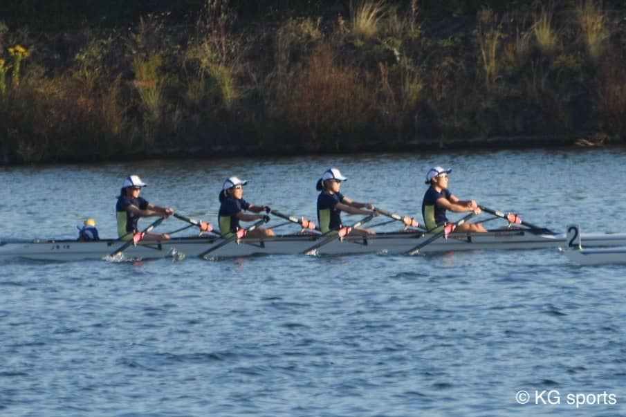 <写真・予選を1着でゴールし、決勝進出を決めた新人女子舵手付きクォドルプル> 11月2日、加古川市立潜艇センター前特設コ…
