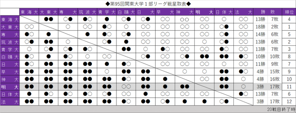 最終週に望みはつないだ。この試合の勝利で最下位を脱した明大。しかし、自動降格回避には次の早大戦で勝つことが絶対条件となり厳しい状況は変わらない。1戦目では16点差で敗れため、得失点差を考慮すると17点差以上を付けて勝利を収めたい。「点差を意識過ぎて負けてしまっては意味がない。まずは勝たないといけない」(富田)。地に足を着け、1部残留を目指す。