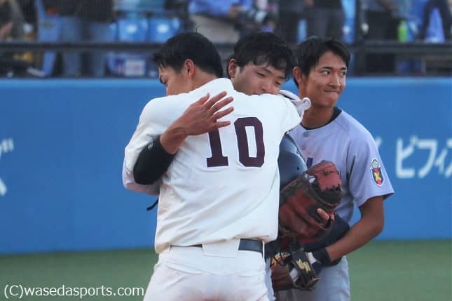同点で迎えた9回2死二、三塁。.000の捉えた打球は一塁手の横を通り、外野へと抜けていく。鳴り響く応援歌が、歓声と悲鳴に変わる。立ち上がれない慶大選手の前で、早大選手たちが歓喜の輪をつくる。1勝1敗で迎えた慶大3回戦。両者一歩も譲らない総力戦となったが、紙一重の差で早大に軍配が上がった。試合後、.000は長年の好敵手・郡司裕也主将(4年)と熱い抱擁を交わした。
