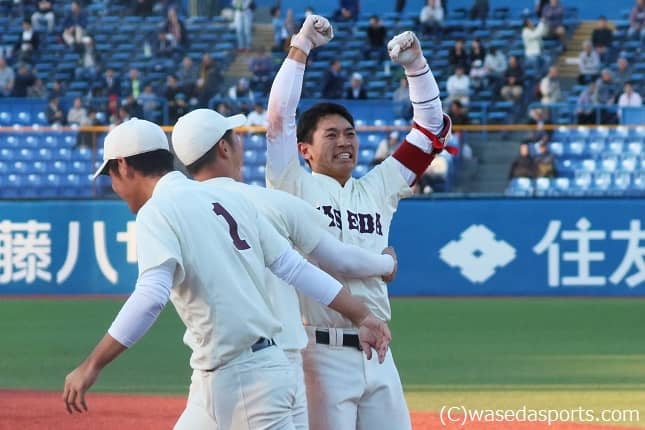 そして迎えた9回。一打サヨナラの場面で打順は金子に回った。打席に入る前、4年生と応援スタンドの仲間の姿が目に入り、思わず涙腺が緩む。そんな金子に主将の加藤が声を掛けた。「1回深呼吸しよう」。一緒に3回深呼吸をする。加藤は「お前が決めてこい」、そう笑って金子の背中を押した。金子は東京・早実高時代から共に戦ってきた先輩の重い言葉を胸に、打席に向かった。そして追い込まれてからの4球目。外角直球を捉えた打球は一塁手のすぐ横を通り、外野へと抜けていく。「本当にうれしかった」(加藤)。三塁走者が本塁を駆け抜け、3日間にわたる激闘に終止符が打たれた。