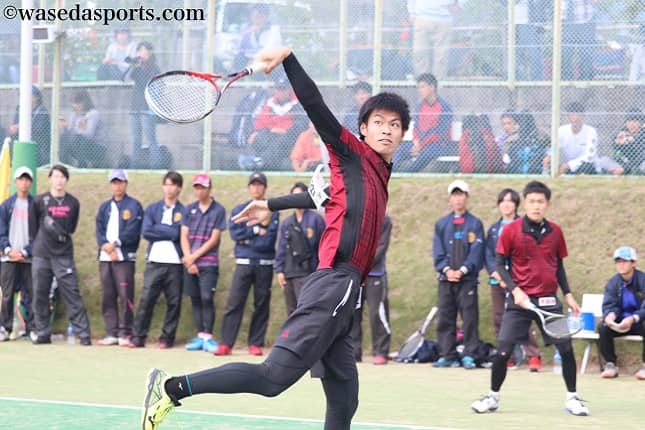 大会初日、法大、日体相手に対して順調に勝利を重ね、3試合目の相手は宿敵明大。一番の後藤佳佑(社3=早実)・増田建四郎(スポ1=北海道科学大)ペアは明大主将ペアに挑むも実力差から敗北してしまう。次に登場した上松俊貴(スポ3=岡山理大付)・水木瑠(スポ1=宮城・東北)ペアは、ペアリングの浅さを全く感じさせないプレーで圧勝する。その後、シングルスの高倉和毅(社2=早実)は調子が上がらずに完敗。ここまで早大勝利数1-2の危うい状況を救ったのが福井達輝(先理3=香川・丸亀)・安谷陸(政経2=沖縄・那覇西)ペアである。スロースタータ―のペアからか、相手の強気の攻めに苦戦し、ゲームカウント1-3になるものの、二人からは焦る様子が見られない。そこから一気にゲームをとりあっという間にファイナルに。後衛である福井がボレーを決めるなど流れを完全に早大に引き寄せ、白星を挙げた。試合後に勝因を尋ねたところ、「最後に僕がボレーをしたのが相手にとって予想外だったと思います。」と福井が答えたように、試合中も歓声が沸く一手であった。最後、早大の勝利を託されたのは山根・内田ペア。安定感のある戦いぶりを見せ、見事勝利。新チーム全員で、明大に勝ったといっても過言ではない試合展開を見せてくれた。