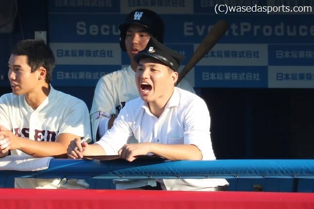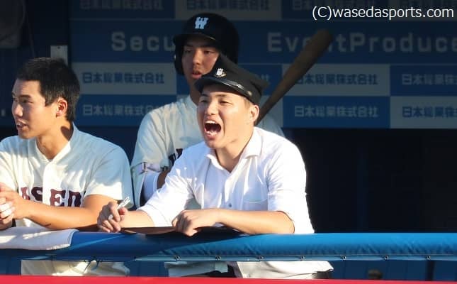 飯島 (夏季オープン戦が終わった後に)今までは全体練習の時間がありませんでした。(今夏はやるようになって)それを最後までだらけずにやれたというのは、選手と感じていましたし。それでも少し気が抜けてしまう部分もあったんですけれども、学生コーチとかが中心になって「だらけなように、だらけないように」と引き締めて何とかモチベーションを保ってやろうとしている姿勢が印象的でした。新人監督(鈴木太郎、スポ4=静岡)とかが苦しんでいる姿を見ていましたし、選手も長時間の練習にしっかり付いていこうと頑張っていましたし。徳武さん(定祐コーチ、昭36商卒=東京・早実)の熱い指導もあって、加藤(雅樹主将、社4=東京・早実)や檜村(篤史副将、スポ4=千葉・木更津総合)とかもその指導を受けて頑張っていたのを見ていたので。