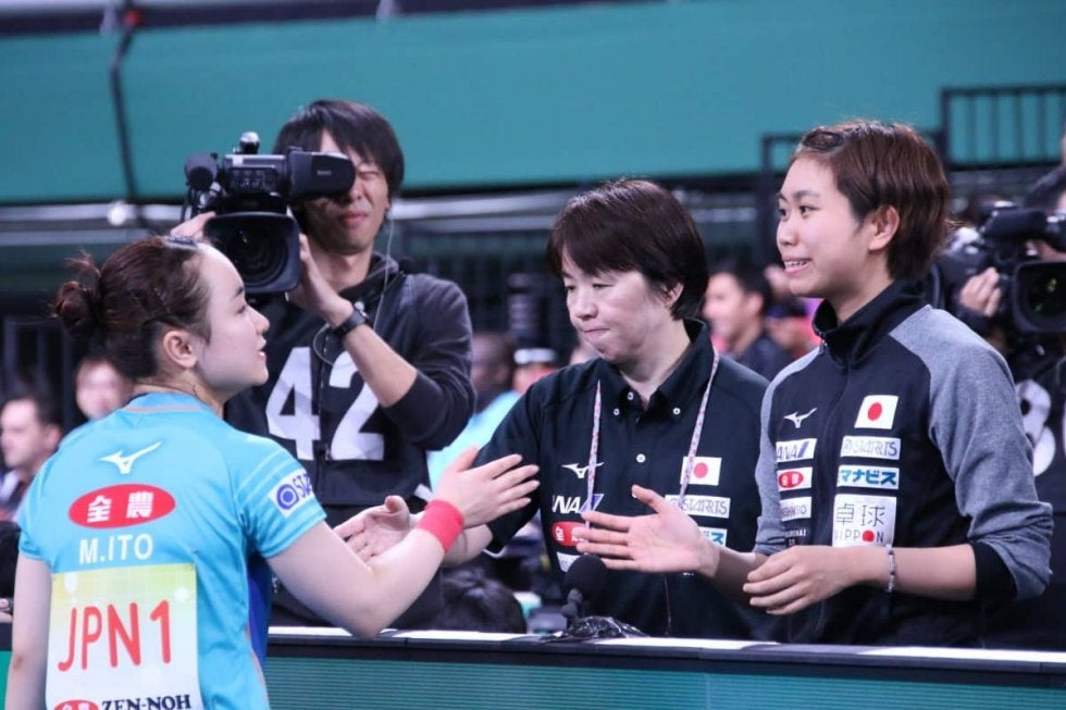 写真:予選を2連勝した日本女子。左から伊藤美誠、馬場監督、佐藤瞳/撮影:ラリーズ編集部