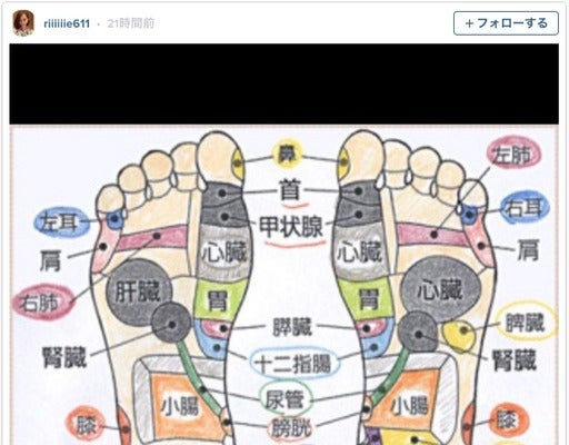 肝臓や心臓、胃など、各内臓に効くとされる、つぼの位置が記された左右の足裏のイラストを投稿。「足のつぼ。これ見て自分でマッサージしよ!」と意気込みを見せるも、「本当にきくのかなぁー?」とコメントするなど半信半疑の様子。