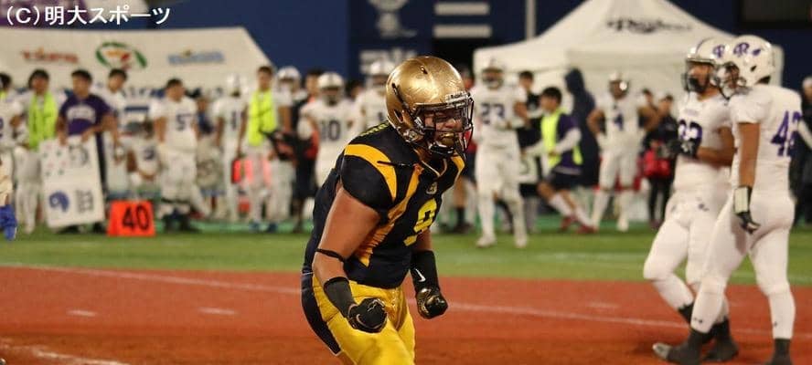 チャンスをモノにした。相手はリーグ戦、明大と同順位である立大。前半は0―13と立ち上がりに苦しむも、後半はディフェンス陣によるインターセプトとパントブロックを得点へとつなぎ、逆転に成功。リーグ内2位に与えられる東京ボウルへの切符獲得に向け、残すは早大戦のみとなった。