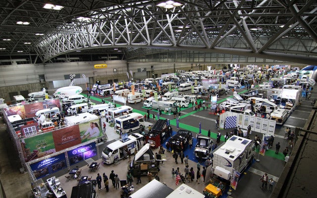 名古屋キャンピングカーフェアでは、キャンピングカーやキャンピングトレーラーなどアウトドアで楽しめる車が展示され、見るだけでなくほとんどの展示車両に入室することができる。