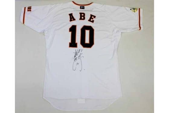 阿部慎之助選手のサインが入った「ありがとう慎之助」ロゴのワッペン付ユニホーム【写真提供:読売巨人軍】