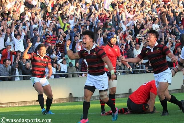 後半、いきなり早大が動く。3分、SO岸岡智樹(教4=大阪・東海大仰星)が得意なギャップを突くランプレーで24−25まで追い付く。しかし帝京大はNO・8リッチモンドら爆発力のあるFWでぐいぐいと押し込みまたリードを広げていく。24−32。1トライでは追いつけない点差のまま時計の針は動き続け、30分が過ぎようとしていた。35分。相手の反則から、敵陣10メートルからマイボールラインアウトのチャンスが舞い込んできた。味方12人で特大モールを形成しゴール付近に近づいていく。そして最後はフランカー相良昌彦(社1=東京・早実)がグラウンディングし29−32まで追いついた。キック失敗によりあと3点。追いつくにはあと4点必要な状況だった。ラストワンプレーに賭けるしかない。「(同点というのは)誰一人頭になかったと思う」と岸岡が話すように、39分、全員の意思でスクラムを選択した。ロスタイムは4分。42分に帝京大にターンオーバーされたが、相手のノックオンに救われロスタイム2回目のスクラム。サインプレーで左に展開したが止められ、右に振る。プロップ小林賢太(スポ2=東福岡)、丸尾とフェーズを重ねじわじわ前に進み、あと50センチを齋藤主将がラックを飛び越え、楕円球を地面に押し付けた。34−32。歴史的勝利の瞬間だった。