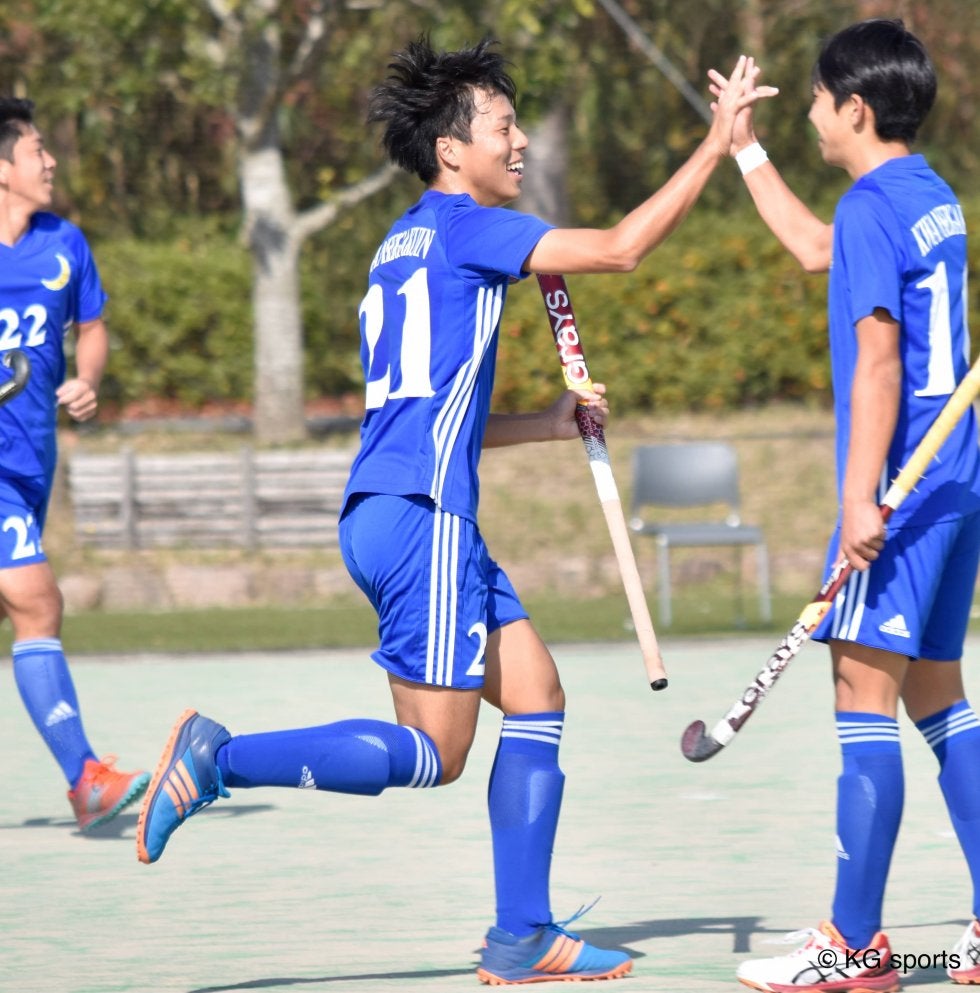 ディフェンスが機能し、堅実に得点を重ねた。第1クオーター(Q)は一進一退の攻防が続き、両チーム無得点で終了。試合が動いたのは第2Q4分。FW村居(法1)のアシストパスにMF西村(総1)が合わせ、大学初得点を挙げた。1点リードで後半戦へ。第3Qは11分にペナルティーコーナー(PC)を獲得。シューターを務めたDF尾島(商3)がシュートを決め、2-0とした。続く第4Qは12分にMF西堀(社1)がリバウンドから力強いシュートを決め、1点追加。ディフェンスは終始相手の攻撃を封じ、1本もシュートを許さず完封勝利を収めた。