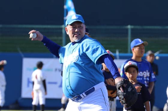 野球教室後には「夢の対決試合」として7イニング制の特別試合が行われる。歴代最多通算407セーブを挙げた岩瀬仁紀氏、通算2050安打の和田一浩氏、名指導者としても活躍した権藤博氏、タレント稲村亜美さんら錚々たるメンバーが参加している。(小谷真弥 / Masaya Kotani)