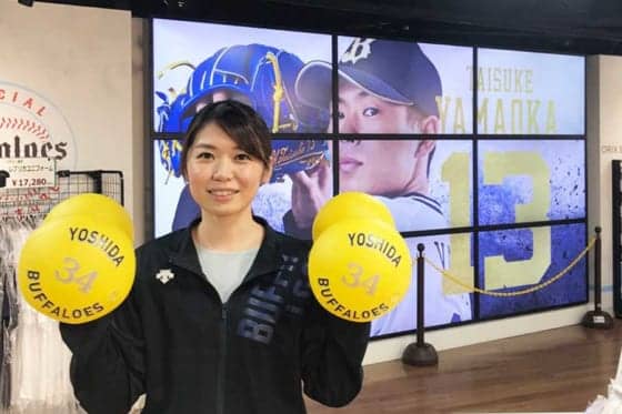 「この応援グッズは私が入社する前の2018年に、『マッチョをイメージした応援グッズを作ってほしい』という吉田正選手からのリクエストから商品化されました。そして、2019年バージョンとしてさらに吉田正選手から『元気に明るく応援していただけたら』ということで黄色のダンベルに変わりました。選手からもこういうグッズを作りたいという声が上がるときがあるんです。それを実現するにはどうしたらいいかというのも、やりがいのある仕事ですね