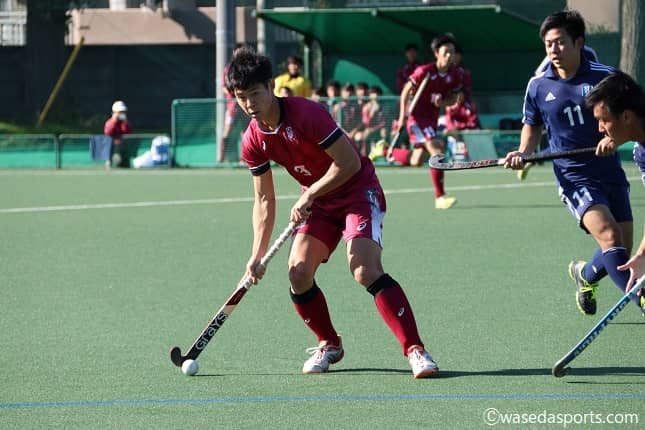 早大のセンターパスで試合は幕を開ける。開始1分過ぎにDF中嶋鍊(スポ4=島根・横田)がグリーンカードを出され一時的に退場する。そんなピンチもあったが試合の流れをつかんだのは早大だった。「良い時間でPC(ペナルティーコーナー)が取れて決めるだけだった」(清水)と第1クオーター(Q)5分過ぎにPCを獲得。ボールを受けたFW清水拓登(スポ3=滋賀・伊吹)が放ったシュートがゴールに鋭く突き刺さる。先制点を奪い勢いに乗るチームは第1Q終盤にもMF大野誠弥主将(政経4=東京・早大学院)がフィールドゴールを決め2対0とする。迎えた第2Qでは序盤に慶大にゴールを許してしまうが、終盤にPCから中嶋がゴールを決め3対1とリードを広げた。