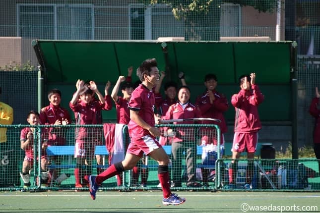 得点に喜ぶDF湯本と早大ベンチ