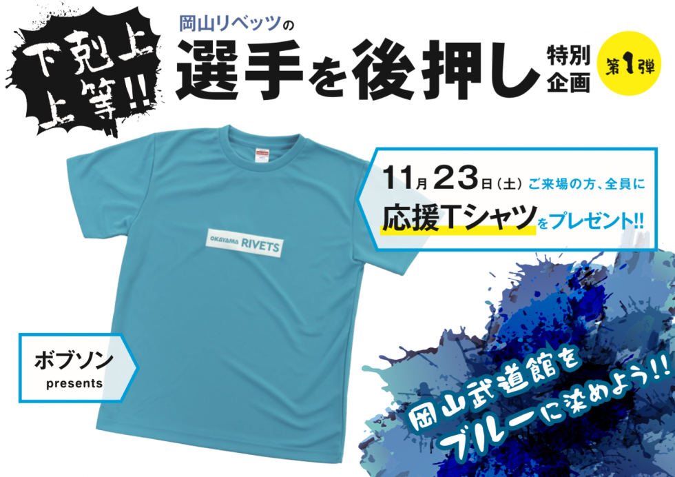 キャンペーン第1弾として、11月23日(土)T.T彩たま戦の来場者全員に「岡山リベッツ応援Tシャツ」(株式会社ボブソンホールディングス提供)がプレゼンントされる。