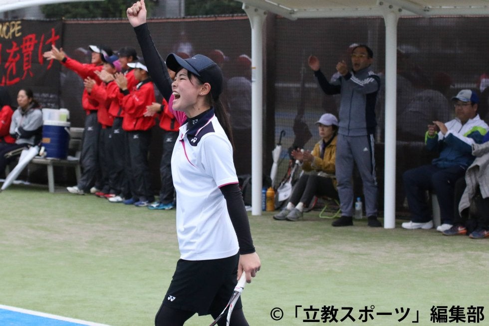 リーグ戦2日目は前日から繰り越しになった対国学院大、シングルス・前山からのスタート。4-1で快勝すると大きなガッツポーズで立大を軌道に乗せた。続く松永・土井ペアも相手にほとんど点を与えず5-1。リーグ戦4勝目をつかんだ。