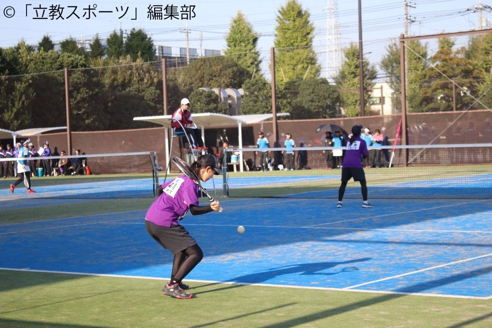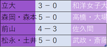 第一試合の相手は和洋女大。1ペア目の森岡(現1)・森本(コ2)ペアは5-0で相手を圧倒。続く前山(現1)は辛くも1ゲーム目を先取するも、その後3本連続で相手選手に取られてしまう。しかし怒涛の勢いで次のゲームを勝ち取ると4-3でシーソーゲームを制した。最後の松永(文2)・土井(文2)ペアは、5-0と圧倒的な実力差を見せつける形で勝利した。