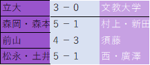 第2試合は文教大戦。森岡・森本ペアが5-1で安定的に1ゲーム目を制すと、2番手の前山は死闘を演じた。1、2ゲームを接戦の末勝ち取るも、1試合目と似た展開でその後の3ゲームを連続で相手選手に取られる。しかし、やはりここからが前山の真骨頂。2ゲームを立て続けに制した。