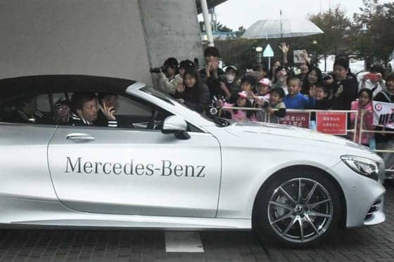 午前10時過ぎ、ソフトバンクの一行はオープンカーやバスに分乗してヤフオクドームを出発。オープンカーにはシートに完全なカバーが施され、各座席には雨合羽も準備されていた。パレード出発点までは屋根をつけての走行となるが、ヤフオクドーム周辺にはすでに多くのファンが“出発”をお見送り。松田宣浩らの選手は車中から声援に応えていた。