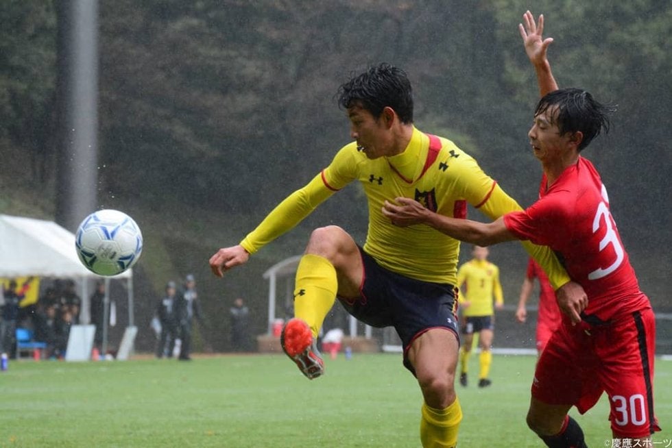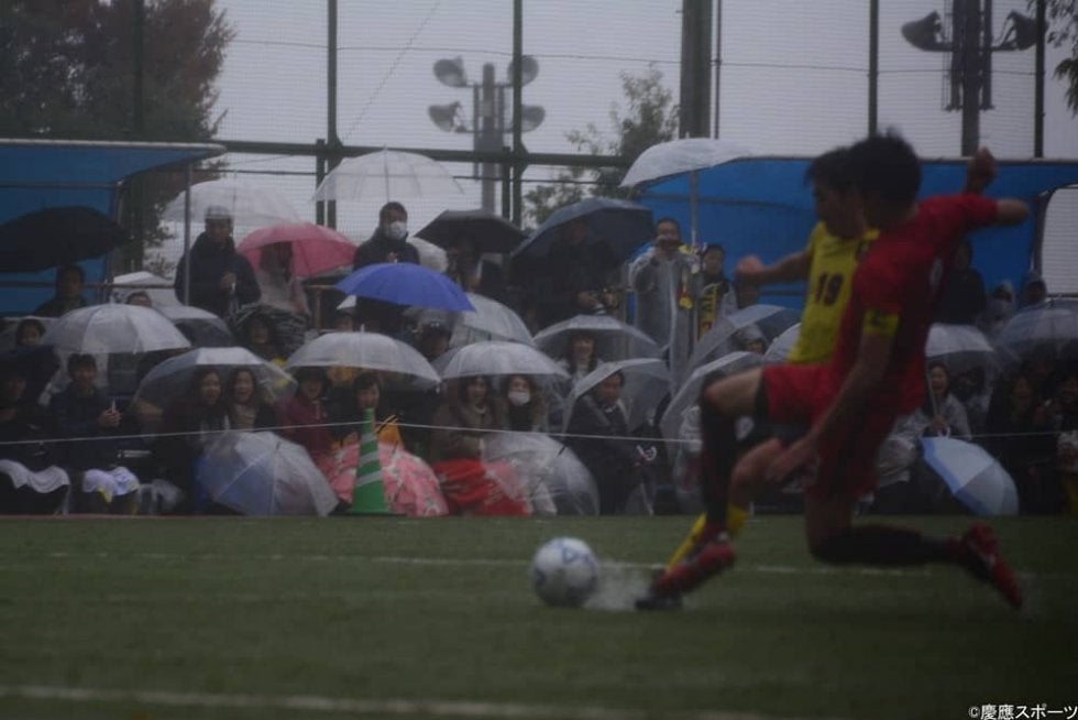 雨でボールが思うように転がらない中、水たまりで止まるボールを奪い奪われ、17分には単独で相手に抜かれゴール前で危機を迎える。しかし、野村京平(総4・國學院久我山)が足でブロックして制し、危機を回避した。リーグ最小失点を誇る慶大DF陣の守備は雨の最終節でも揺るがない。得点機会を窺う慶大は、23分、酒井綜一郎(政2・慶應義塾)から多嶋田雅司(商4・國學院久我山)への見事なロングクロス、27分、佐藤海徳(政4・桐光学園)の力強いシュートと、得点への期待が高まるプレーを続けて見せたがいずれもゴールネットは揺らせなかった。28分には相手にスピード感のあるシュートを放たれピンチかと思われたが、守護神・田原智司(環3・静岡学園)の見事なキャッチでゴールを守り切った。その後は橋本の度重なる積極的なボール運びがチャンスを生み、45分に橋本から福本に正確なクロスが渡ったが、ゴールとはならず、スコアレスで前半は終了した。