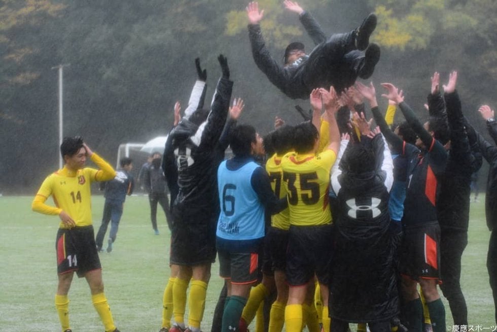 前節で昇格を決め勝てば自力で優勝となる最終戦。この大一番はあいにくの雨によって両チーム水がたまったフィールドでのプレーを強いられ思うようにボールを回すことができない。両チーム無得点で迎えた後半の57分、福本拓海(環4・済美)の低めのクロスを八田和己(総4・桐蔭学園)がダイビングヘッドで押し込み待望の先制点を挙げる。さらに74分には橋本健人(総2・横浜FCユース)のクロスを福本がゴールに沈め追加点を決める。その後もリードを守りきり試合終了。シーズン前からの目標であった最少失点での優勝を最後に達成して有終の美を飾ることに成功した。