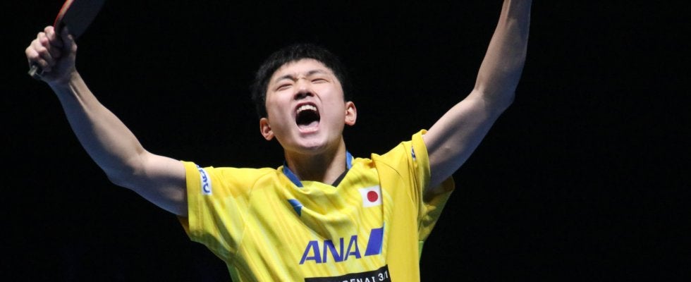 写真:勝利の瞬間、喜びを露にした張本智和(木下グループ)/撮影:ラリーズ編集部