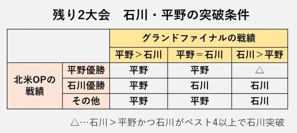 石川はグランドファイナルでベスト4以上が必須、尚且つ平野より勝ち進む(石川>平野)ことが条件となる。