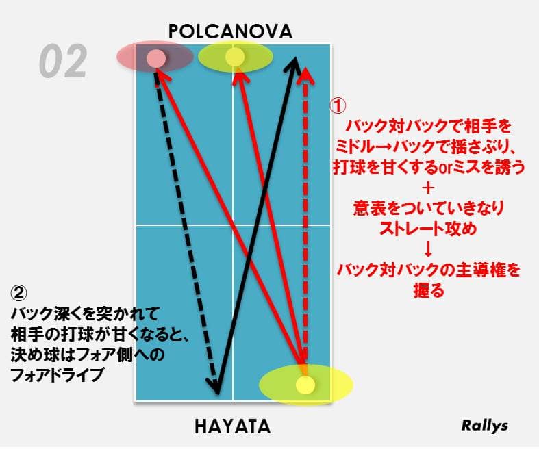 バック対バックでは、ミドルを狙われた際の反応が重要になる。早田はミドルにボールが来た際に横回転を加えて単調なボールにしないようにするか、素早くミドルに入り、万全の態勢でバックハンドで返球する。対してポルカノバは長身選手の弱点でもあるミドルの反応が遅く、緩い打球で返球することが多かった。