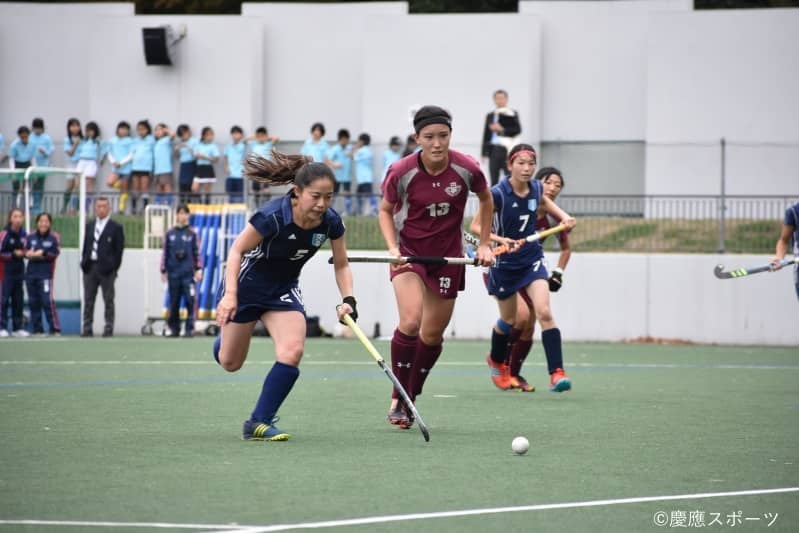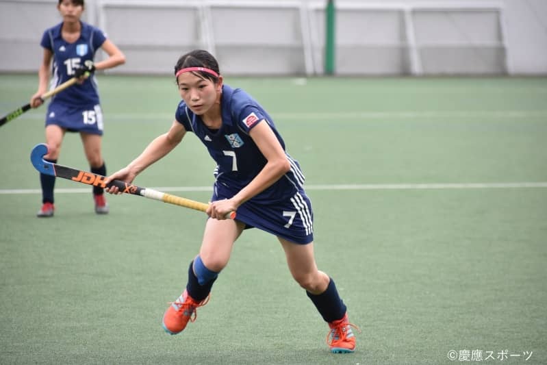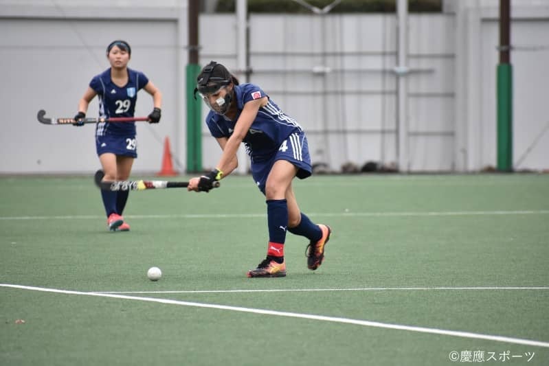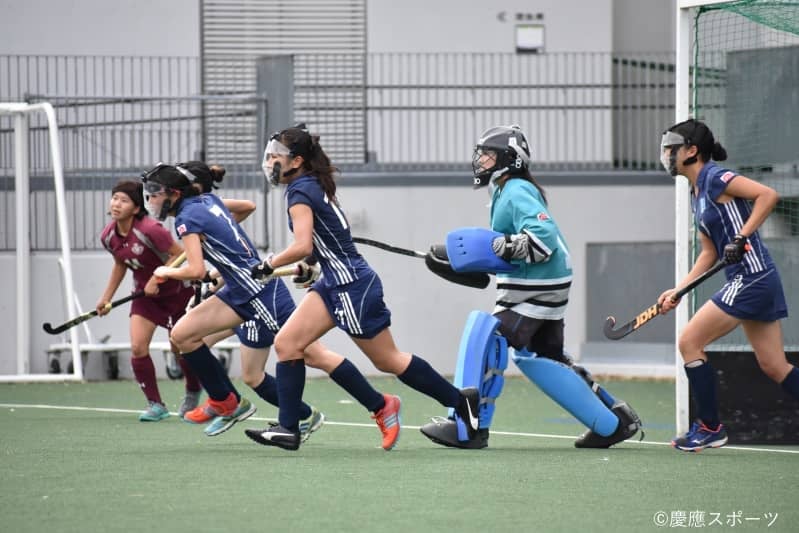 続く第2Q、慶大は、安達理紗(法3・慶應湘南藤沢)から花田ともみ(政3・慶應湘南藤沢)、小泉理央(政4・慶應湘南藤沢)へ、DF→MF→FWとボールをつないでチャンスを作る。そして4分にはPCを獲得し、ヒッターの西本による強烈なシュートが繰り出されるも相手キーパーに阻まれゴールを割ることができない。一方の慶大GK・山田も「自分が想像していた通りのボールが来た」と相手に追加点は与えず、慶大は1点ビハインドで前半を折り返した。