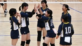 <写真・山畑(中央)のサービスエースに喜ぶ選手たち> 11月27日、東京都大田区総合体育館にて、第66回秩父宮妃賜杯…