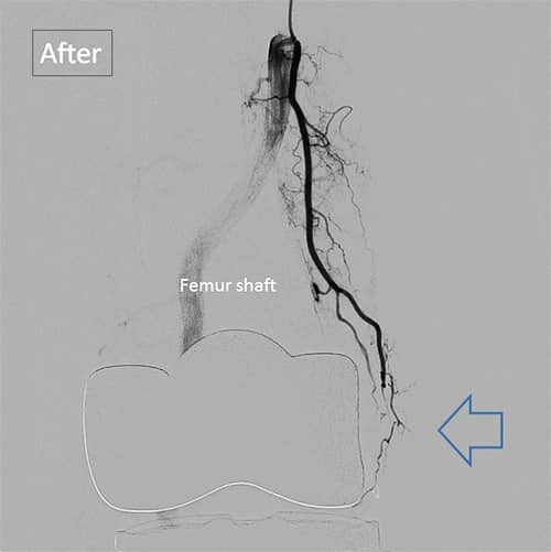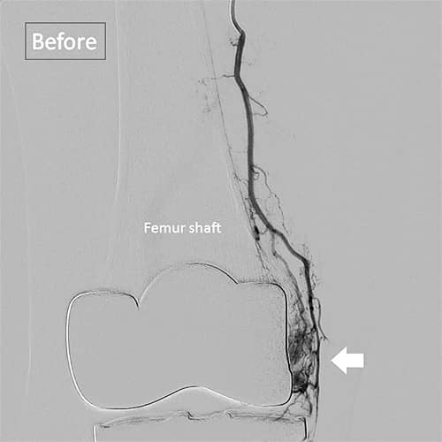 上の写真は、やはり人工膝関節の手術をした後に遺残疼痛を持っていた患者さんの血管撮影の写真です。ひざの内側の部分に不要なモヤモヤ血管がたくさんできていることがわかります。