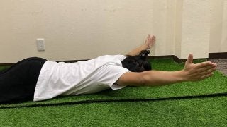 両腕と胸を持ち上げる。肩だけではなく、肩甲骨を動かすイメージで腕を上げるようにしましょう。